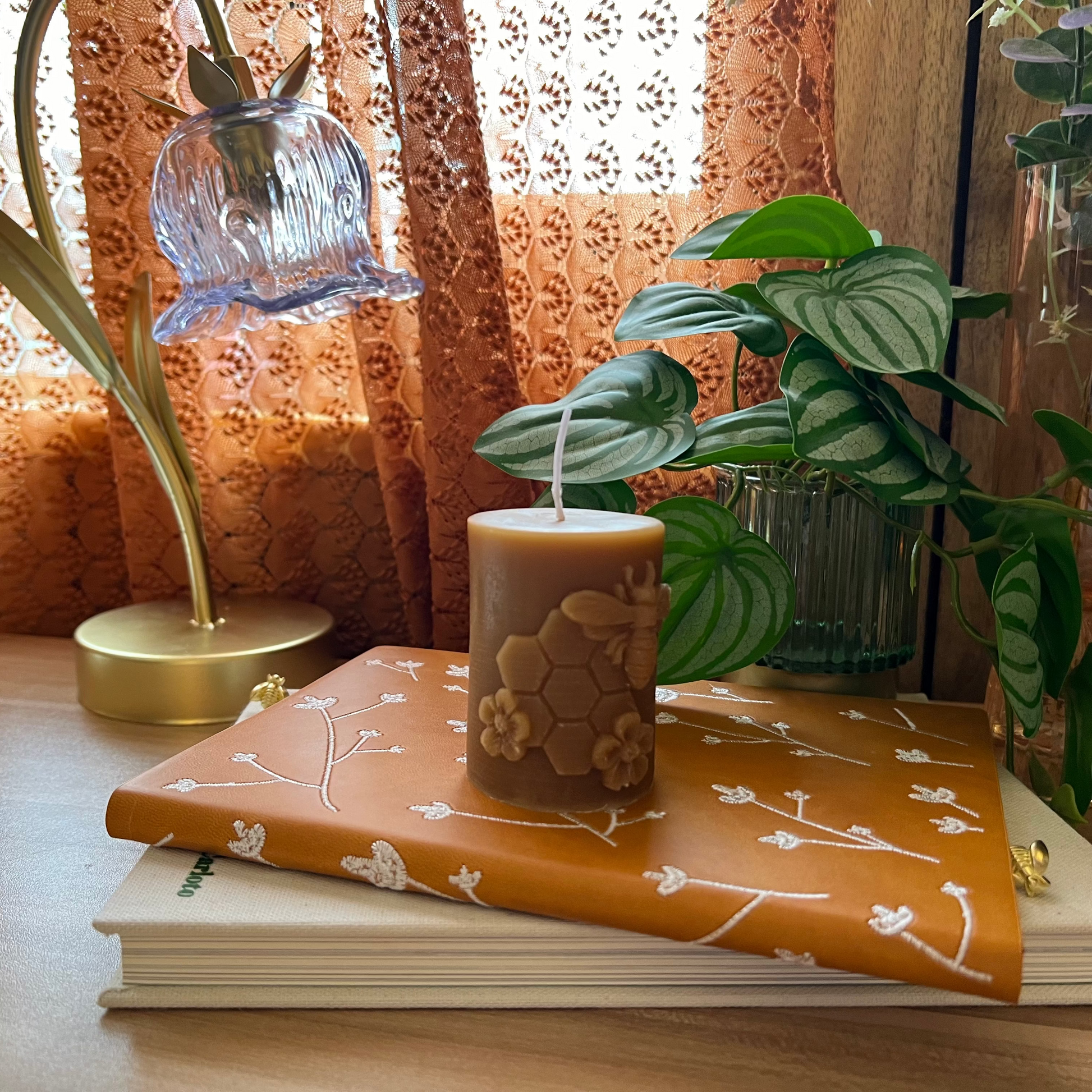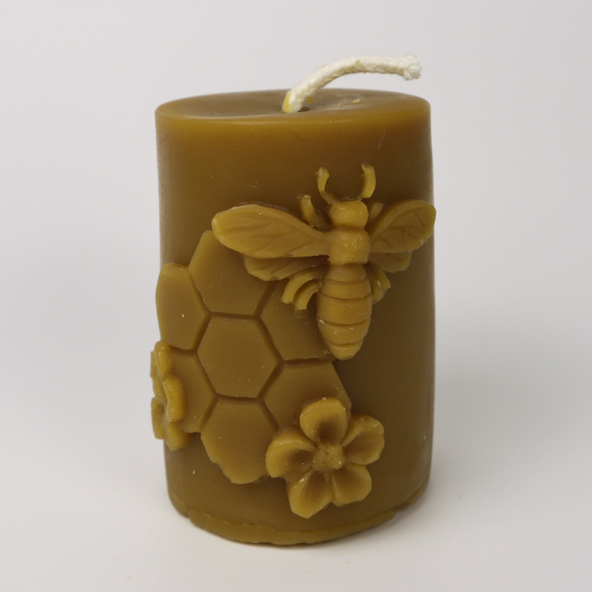 Ilumina tu espacio con nuestra vela de cera de abejas con forma de hexágono y cilindro de flores hecha a mano, elaborada con cera de abejas 100 % pura de nuestras colmenas. Las características incluyen:
