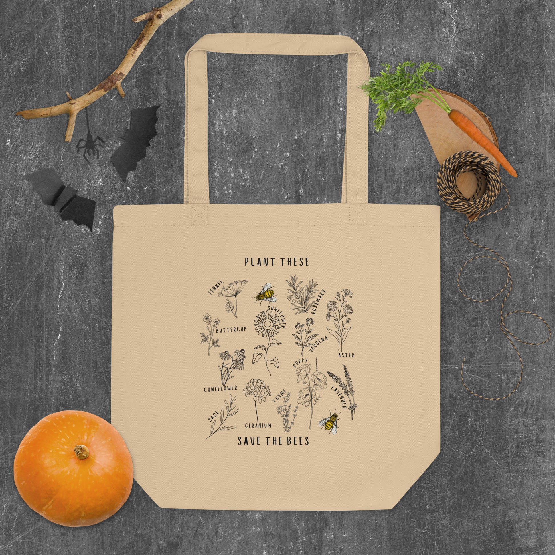 Bolsa de tela con la frase "Planta esto y salva a las abejas"