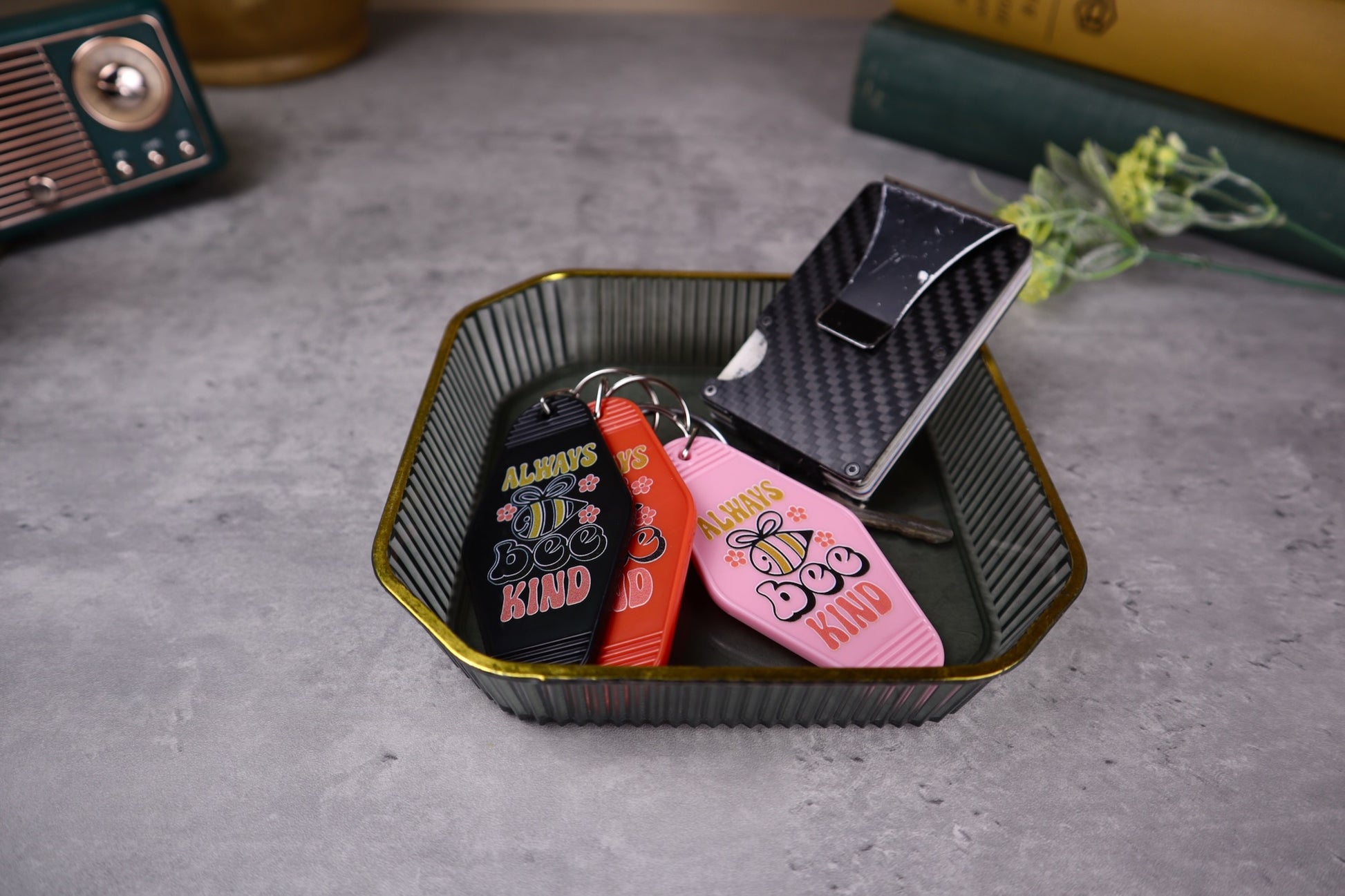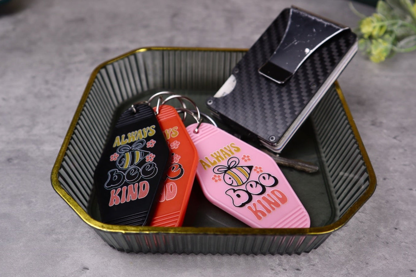 ¡Lleve un recordatorio audaz de la bondad con nuestro llavero de motel vintage "Bee Kind"! Inspirado en los diseños clásicos de llaves de motel, este llamativo accesorio presenta un llamativo gráfico de abeja junto con el inspirador mensaje "Bee Kind". Su estilo retro combinado con un diseño vibrante lo convierte en el complemento perfecto para sus llaves, bolsos o mochilas. Fabricado con materiales duraderos, este llavero es tan práctico como elegante, y sirve como recordatorio diario para difundir la bondad dondequiera que la vida lo lleve.